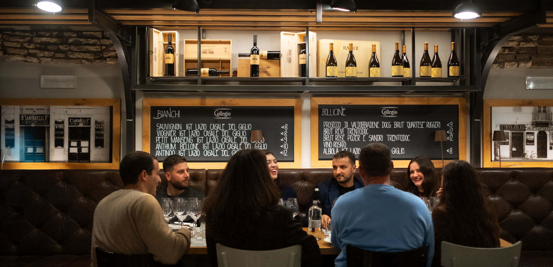 La storia del Collegio è intrecciata a quella della famiglia Santarelli, che da oltre cent’anni vive il vino e il cibo come cultura quotidiana. Dalla fine dell’Ottocento, tra botteghe di vini e liquori, fino al ristorante nato nel 1924 in Piazza Capranica, generazioni diverse hanno custodito la stessa idea: materia prima, rispetto del tempo, ospitalità sincera.